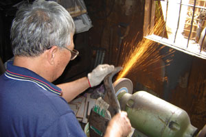 打鐵老師父吳忠雄先生,現年68歲,是將軍鄉人,做打鐵這行業已有50年的歷史,早期玉井農業發達,農具用途很廣,諸如鋤頭、鐮刀...都要用到鐵器,吳先生訴說著過去一段輝煌的歷史,下次來去玉井北極殿拜拜時,別忘了來參觀。