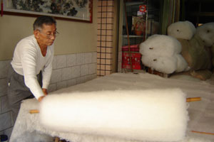 棉被店的老板邵玉輝老先生,祖先是將軍鄉人,由祖父、父親到他這一代做棉被這一行業已有100年以上的歷史,真所謂百年老店,現在要看到純手工做的棉被和枕頭已經很少了,雖然手工較貴,但還是有很多顧客不遠千里來訂製。