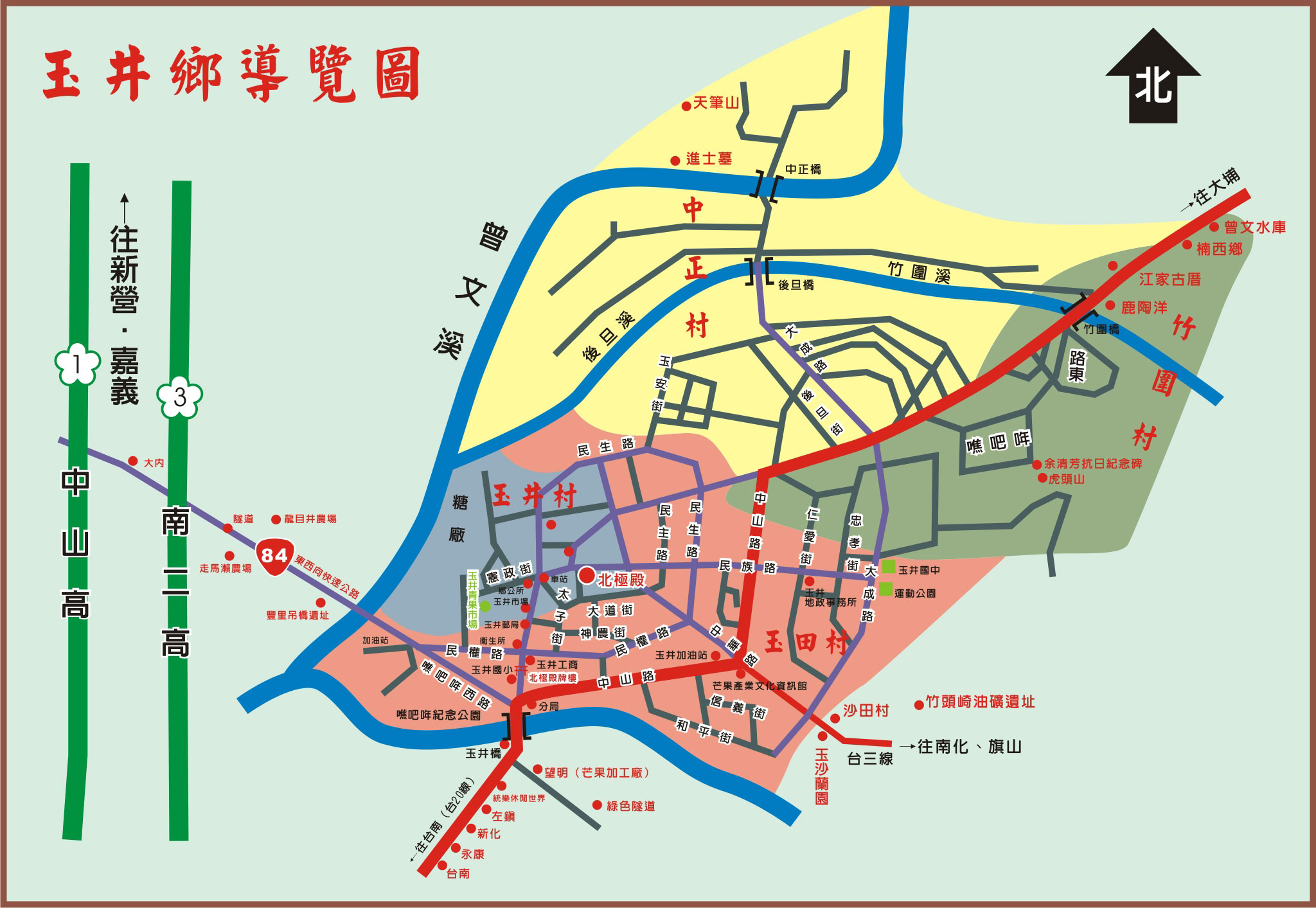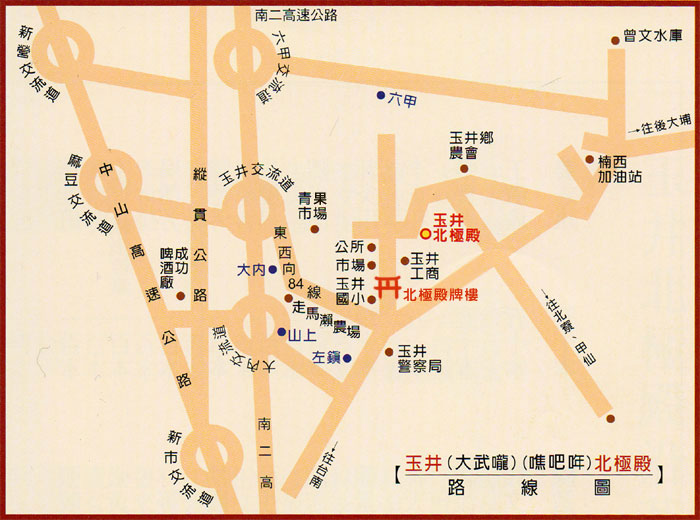 《交通指南 》: 中山高速公路→麻豆交流道下→往玉井交流道→東西向84線→玉井國小左轉→過玉井工商右轉→玉井北極殿。 《位置圖》: